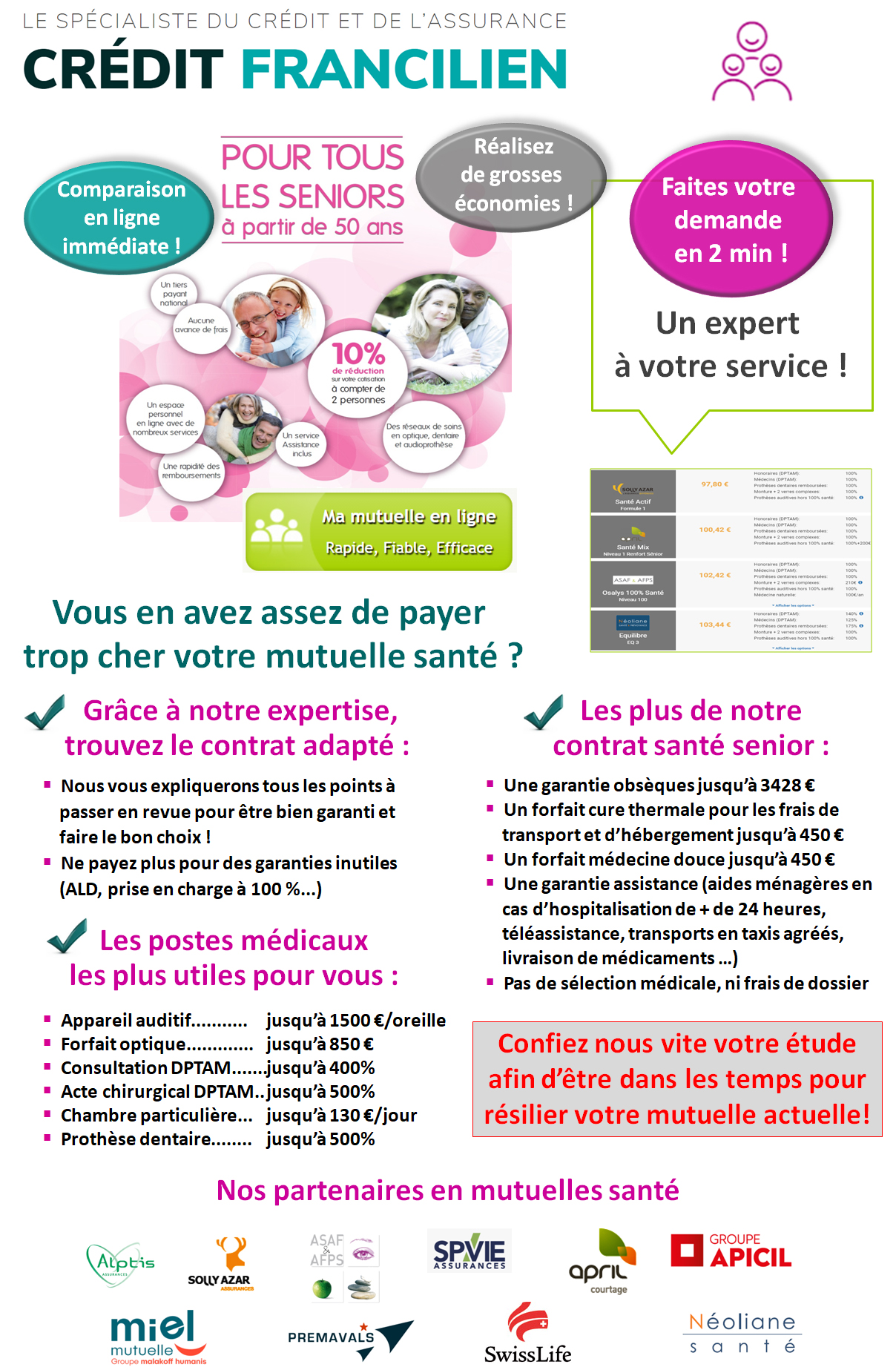 je recherche une mutuelle santé SENIOR sérieuse avec une bonne couverture dentaire optique et hospitalisation, de bon rapport qualité-prix. Il existe beaucoup de comparateurs de mutuelles sur internet. J'ai fait plusieurs simulations et j'ai ensuite été démarchée par téléphone par des courtiers qui me font des propositions intéressantes.