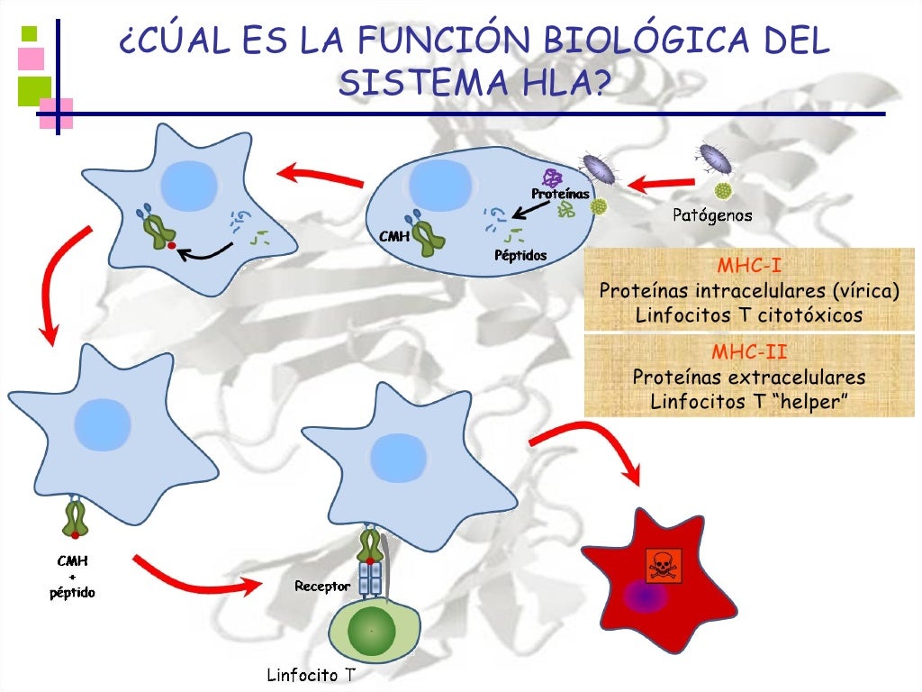 1 Departamento de Medicina Experimental, Facultad de Medicina, UNAM. Las moléculas del complejo mayor de histocompatibi-lidad (CMH), también llamadas antígenos leucocitarios hu-manos (HLA), son el producto de un conjunto de genes responsables de que los linfocitos rechacen tejidos tras-plantados y detecten elementos extraños. Estas.