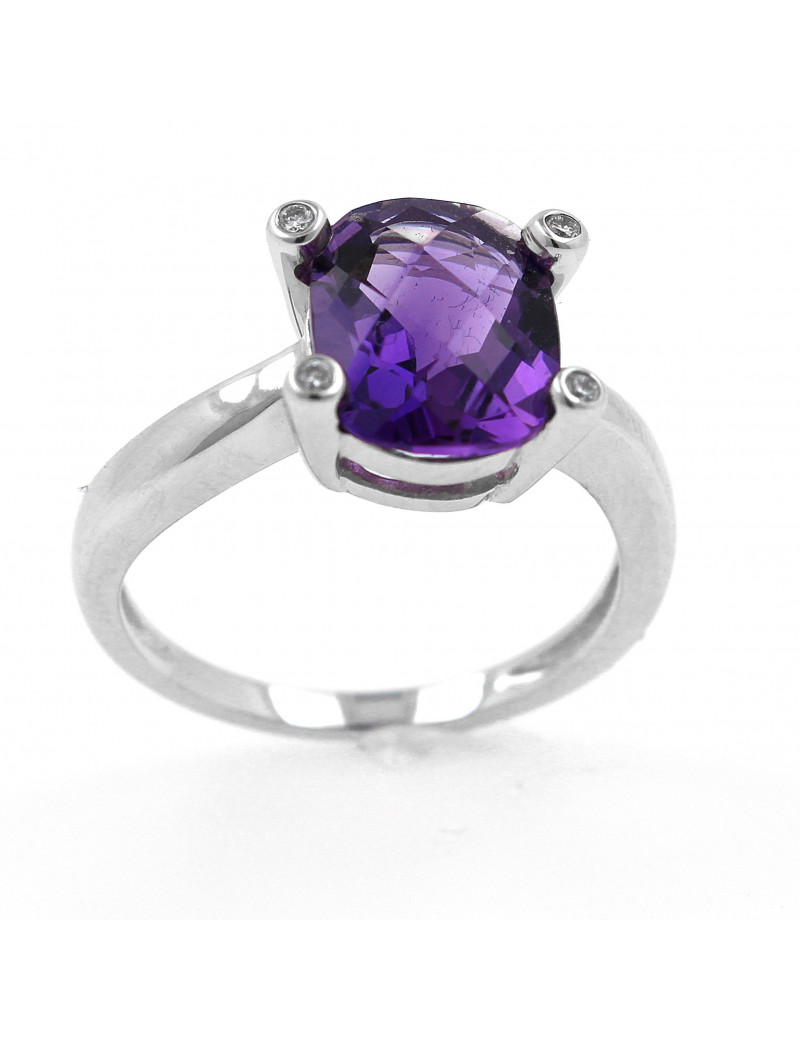590 €. Un anillo muy moderno y que será parte integrante de los complementos que querrás ponerte todos los días. Realizado en oro blanco de18 kts. su amatista central multifacetada llama siempre la atención, y cuatro diamantes talla brillante en los laterales le dan el último toque. SKU: 0AN040022 Etiquetas: anillos, anillos gemas color.