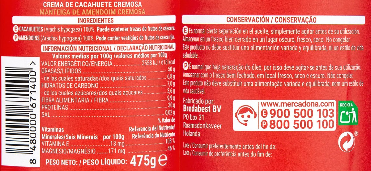 Solo cacahuetes en crema y con trozos para darle el toque crujiente. En cuanto al valor nutricional de esta crema, por cada 100 gramos de la crema de cacahuetes de Mercadona: Valor energético: 618 calorías. Grasas: 50 gramos. De las cuales, saturadas: 6.8 gramos.