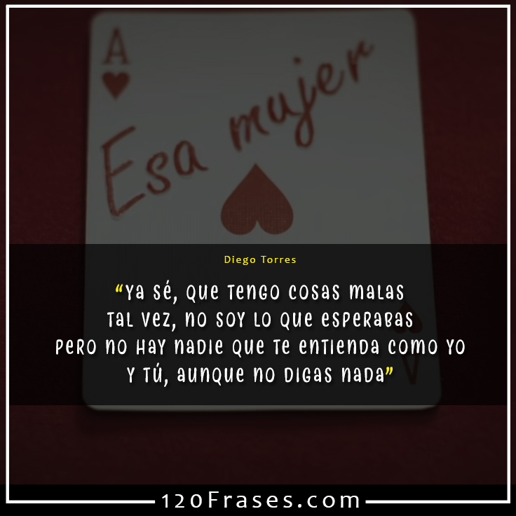 La letra de Esa Mujer de Diego Torres ha sido traducida a 1 idioma (s) Ya sé, que tengo cosas malas Tal vez, no soy lo que esperabas Pero, no hay nadie que te entienda como yo. Y tú, aunque no digas nada Sentí, en tu boca pintada La miel que a veces se te mezcla con dolor No quiero que cambies hoy nada por mí Nadie es perfecto, yo te quiero.