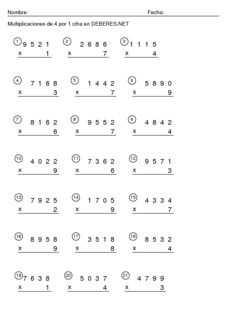 Multiplicación por na cifra con llevadas,. Level: 4º PRIMARIA. Language: Spanish (es) ID: 402396. 05/10/2020. Country code: ES. Country: Spain. Download PDF Loading ad. LIVEWORKSHEETS. Interactive Worksheets For Students & Teachers of all Languages and Subjects.