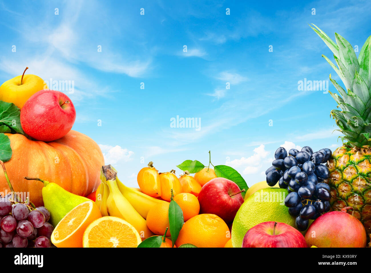 Gran colección de frutas y verduras en un fondo de cielo azul. La comida saludable. Copie el