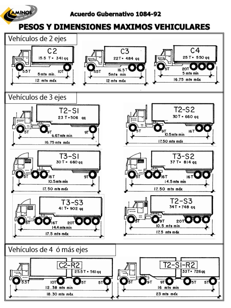 Los pesos máximos establecidos por la normativa son los siguientes: Para los camiones de 2 ejes, el peso máximo es de 18 mil kilogramos. Por su lado, en los camiones de 3 ejes se eleva este límite hasta las 25 toneladas. No obstante, en el caso de que el camión en cuestión disponga de un eje motor equipado con neumáticos dobles y.