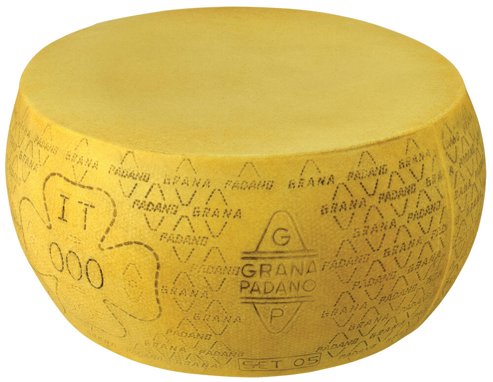 El Grana Padano es un queso típico italiano duro, semi-graso, que está cocido y que madura lentamente, hasta el año y medio. Se produce cuajando la leche de vacas alimentadas básicamente con hierbas forrajeras.. Una rueda de Grana Padano es cilíndrica, con lados ligeramente convexos o casi rectos y de caras planas. Mide de 35 a 45.