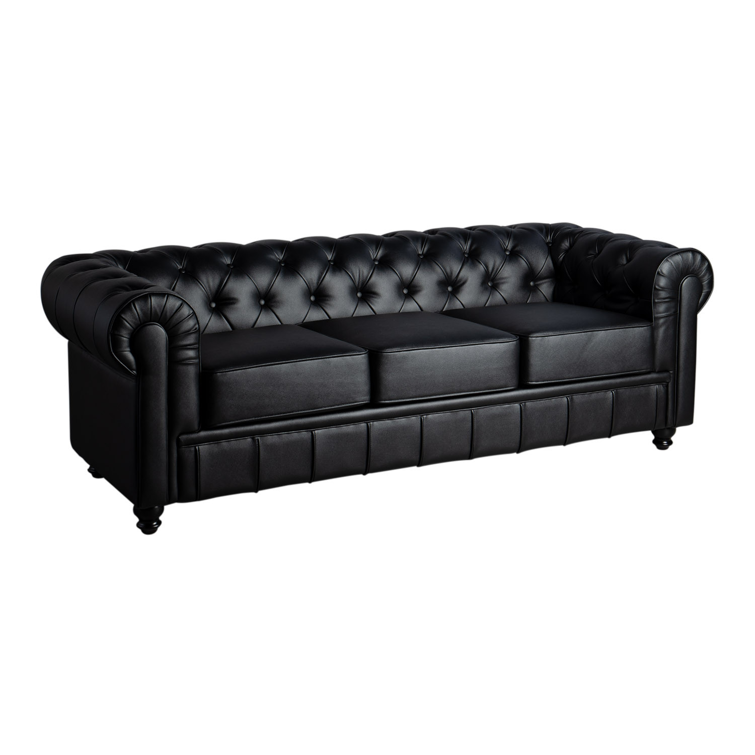 Descripción del producto. Ref. 232847. ¡Crea una atmósfera digna de un distinguido club inglés en tu salón con el sofá de 3 plazas de cuero negro CHESTERFIELD! El modelo Chesterfield es, ante todo, un cómodo sofá de 3 plazas en el que descansar y disfrutar de agradables momentos de relax.